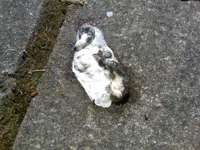 Sniglar är sniglar. Fågelbajs är fågelbajs. Det här är det senare, och den missade mig med några centimeter. Bara för att ni inte ska tro att livet är en enda dans på rosor, utan även har sina osköna stunder. I ett gammalt tidningsbildarkiv skulle bilden säkert arkiveras som fågelbajs, med tillägget kan även användas som spilld glass och, efter viss beskärning, glaciär i juramassivet.