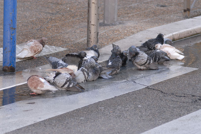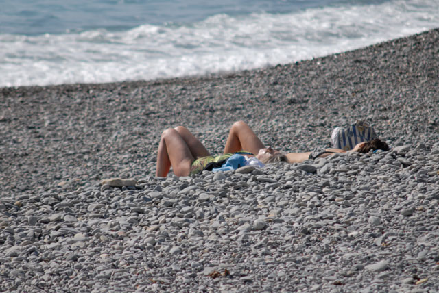 Ibland är det fullt på stranden. En del stränder är populärare än vanligt. Den här var så i ropet att ingen ville gå opp, fast bussarna åkte bara millimetrar från strandkanten. Den riktiga stranden blir allt populärare för var vårdag som går. Idag hade två pionjärer borrat ner sig ordentligt i stenarna, för att få årets första naturliga bränna och undvika den fortfarande kyliga vinden.