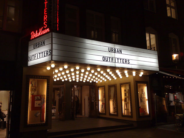 Röda kvarn. Barndomens biograf där dörrvaktmästaren var så bussig och släppte in oss på den nya Bondfilmen, fast vi inte hade fyllt rätt ålder. Fortfarande står det Röda kvarn på kanten, men sedan står det Urban outfitters också. Hade det varit på den tiden, när det var en röd biograf, så hade jag trott att Outfitters var en mycket, mycket barnförbjuden film. Nu vet jag att det är en vanlig affär, som så mycket annat som huserar i de gamla lokalerna. Men i takt med tiden blir det säkert biograf snart igen, och jag hoppas att det då kommer att finnas en dörrvaktmästare som förstår att hålla dörren öppen precis lagom länge för att någon yngre nyfiken ska kunna smita in och få se den nya Bondfilmen. För Bond, han kommer alltid att finnas.