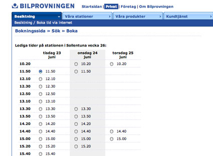 Nu går det utför för ett av våra sista monopol. Svensk bilprovning. Första lediga tid i Sollentuna idag är den 23 juni. Ringer man till den personliga “servicen” så blir man hänvisad till Strängnäs 14 april. Några andra tider finns inte i Stockholmstrakten, kanske för att “dom” håller på med datan. Vilka “dom” är kunde bokningen inte upplysa om, kanske är det musikbranschen som jagar nedladdare. De har ju fått en IPRED lag att leka med idag.