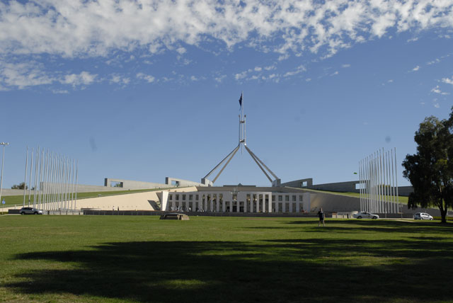 Och i Canberra, som är så tråkig som det bara kan bli i en påhittad stad, finns det heller ingen annan bild att välja än parlamentet på kullen med utsikt över — just inte mycket.