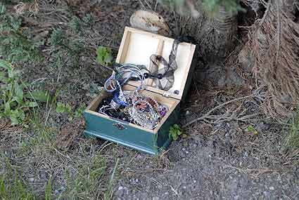 Det var tidigt på morgonen. Solen hade precis gått upp, när jag hörde ett frasande ljud utanför ytterdörren. Jag vet inte vad det var. Jag trodde det kunde vara en duva som ramlade ner från taket. Eller kanske tidningsbudet som kom med tidningen. När jag öppnade dörren såg jag bara en mantel som försvann runt hörnet av huset, och nedanför den ensamma enen såg jag något som blänkte. Det var en liten skattkista, locket var öppet och juveler för tusentals kronor blänkte i morgonsolen.