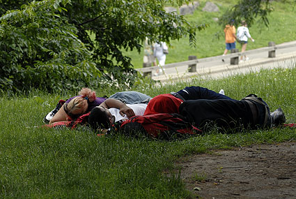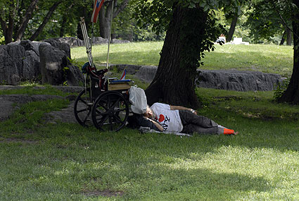 Det gick inte förr, då när jag var 14 och gick med pappa och såg Cliffs of Lavendel hill på en klubb i Greenwich village. Då kunde man knappt gå in i Central Park mitt på dagen om man inte ville bli rånad, än mindre ta sig en tupplur och spara sovpengar. Nu leker barnen där, backpackers och hemlösa vilar ut och turisterna hyr cyklar, rullskridskor, hästdroskor och cykelkärror för en stunds andhämtning i vardagslunken.