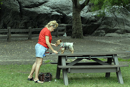 Miljonärernas lägenheter skymtar mellan träden, där i fjärran, och deras barn leker i parken med sina Nannies. Newyorkborna som bor i närheten kommer ner i parken för sina dagliga rutiner, de kammar sin hund,äter frukost, tar en snabb promenad eller vilar ut på en parkbänk med morgontidningen innan resten av dagen tar vid.