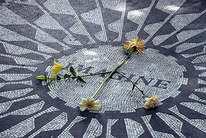 Det är en vanlig måndag morgon i parken. Vid Strawberry fields är Imaginemosaiken helt nystädad, så jag lägger ut fyra blommor i traditionellt mönster, lagom till att första busslasten med japanska turister tjattrar sig runt jordgubbsfältet.