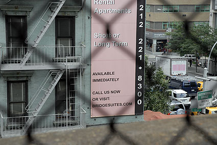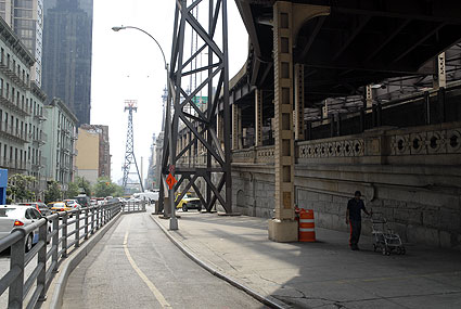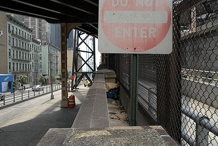 Mitt emot skylten som lockar med inflyttningsbara ettor från endast ca 15 000 kronor i månaden, bor hemlösa i ett litet utrymme mellan gångvägen över Queensboro Bridge och brokanten. I den smala håligheten har de riggat upp pappkartonger, en del med liten dörr på. Det verkar som om man bor två och två i varje sektion. Jag tittade in i en av kartongerna, den längst upp från broslutet.