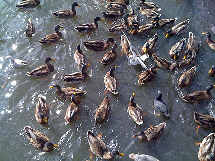 Det är spännande att mata fåglar. Men de är väldigt många, och en del är dessutom så företagsamma att de tar en genväg till brödet, och smyger upp bakifrån.