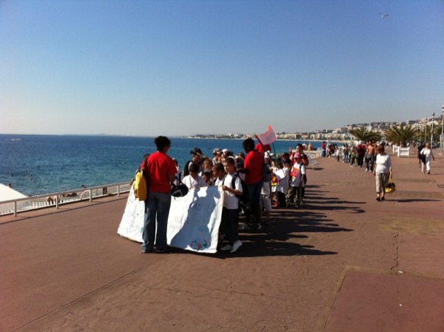 Det ska böjas i tid… Idag hade smÃ¥skolan runt hörnet demonstrationskunskap, och fick lära sig hur man gÃ¥r i tÃ¥get, hur man skanderar och hur man hÃ¥ller standaren. De fick till att börja med gÃ¥ klassvis, sen samlade man ihop sig längre fram. Jag tror man demonstrerade för att rädda jorden och för en bra miljö. Imorgon är det strejk pÃ¥ riktigt, trafikledarna demonstrerar och flygen blir försenade. Det är smällar man fÃ¥r ta…