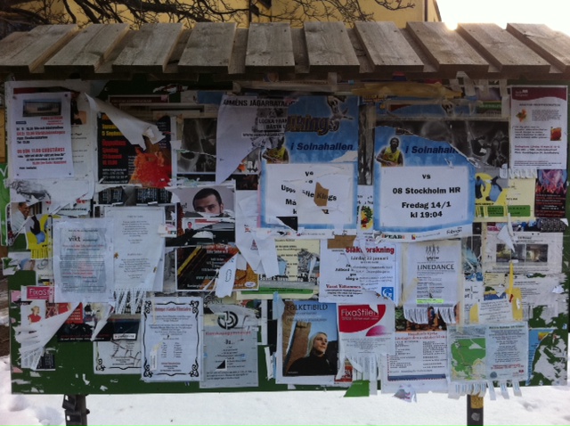 Av allt att döma finns det mycket att göra i omgivningarna. Jag har ibland tänkt tanken att det finns en hel bok oskriven på en sån här gammal anslagstavla. Och medan anslagstavlans signaturmelodi ekar i mitt huvud, (dam dam damtidam dam tidam dam dam tidam osv) så växer boken fram. Den är fylld av tappade hundar, rum att hyra, vagnar att köpa, saknade barnvakter, obskyra möten och nån som gärna vill städa på eftermiddagen, eller ge massage, vilket som passar bäst.