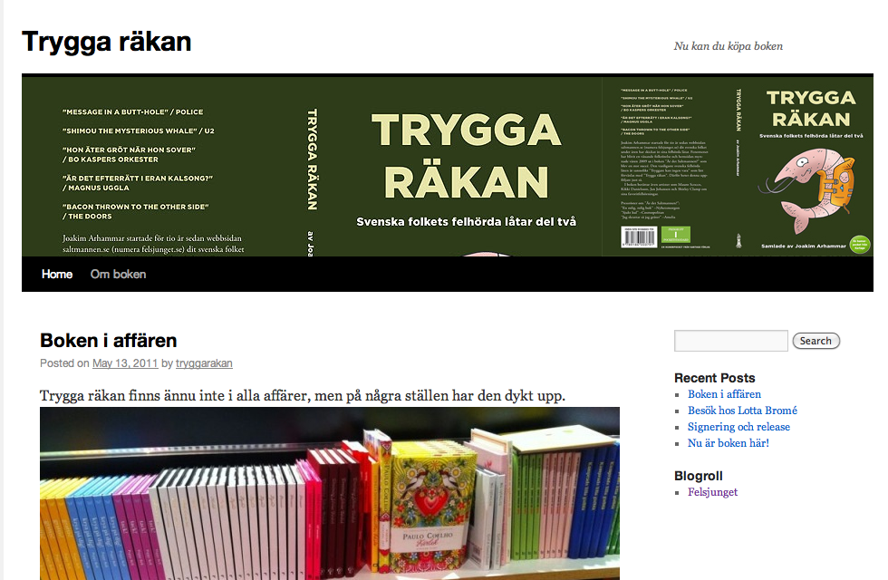 Igår var det releasedags för Joakims nya bok Trygga räkan, och idag har boken börjat dyka upp i affärerna. Det ser ut att snurra till ordentligt, och Trygga räkan har fått sin egen hemsida med lite bilder från de senaste dagarna. Varför inte ta en sväng dit och titta?