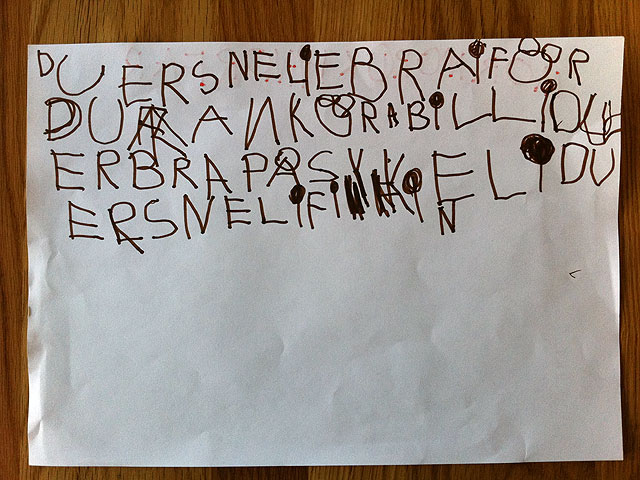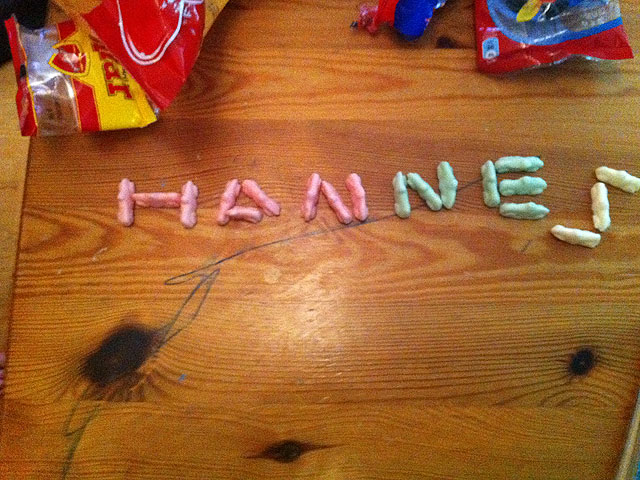 Hannes skriver sitt namn med godis, när han ändå sitter och inte gör något annat. Och Bella har börjat med berättelser, nu när hon lyckats få till bokstäverna. Hoppas deras skapar- och berättarglädje håller livet ut.