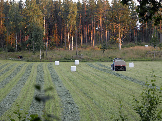 UFO äggen växer fram på fältet i kvällssolen, medan korna idisslande tittar på. Det är deras mat som paketeras så fint inför vintern.