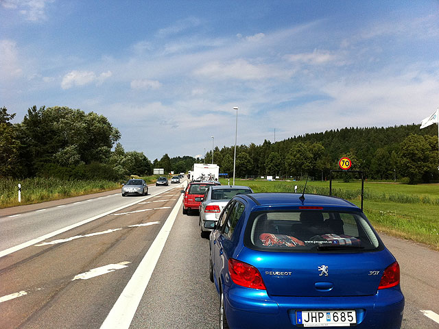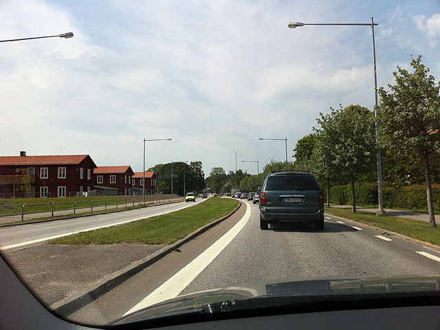 Sju trafikljus. Och en bro över Göta kanal. Bron kan jag förstå, båtarna måste ju passera någonstans. Men sju trafikljus?! I lilla Söderköping? Om trafikljusen är ett mått på hybris, så går första, andra och tredjepris till Söderköping. Här fixar man en kö dygnet runt tack vare trafikljus som dessutom är lika röda lika länge åt alla håll vare sig det kommer en bil eller inte. Här om någonstans stämmer klyschan “hur tänker man”. Förmodligen inte.