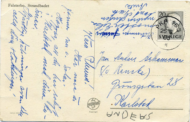 Falsterbo mitt i sommaren 1955. En farmor badar och känner sig manad att tala om det för lille fyraårige plums. Jag tror inte han vill bli kallad det så länge till. Farmors syskon har också skickat med sina skrivna hälsningar, till och med hennes bror och hans familj. Brodern heter Anders, ett namn som plums egentligen bär och fått ärva.