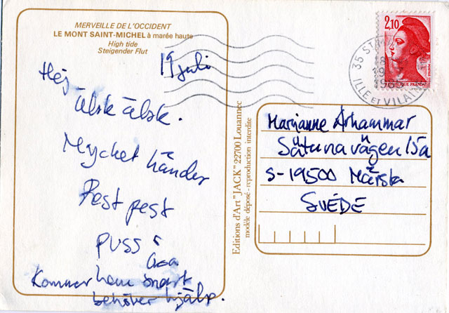 Tänk att ni är en orolig mamma. Tänk att ni får detta kort från er i princip vuxna dotter. Är det tårar som har suddat ut texten på baksidan? Vems?