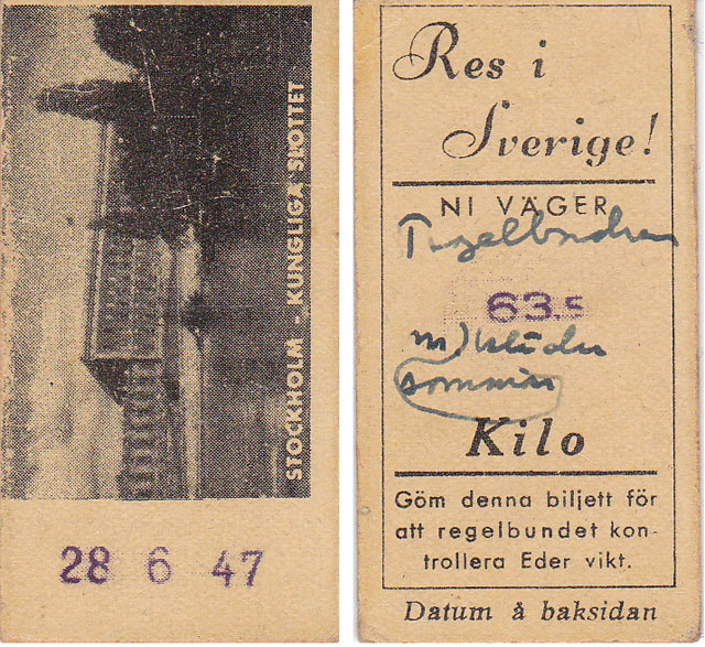 Det är den 28 juni 1947. Någon går på Tegelbacken, det Tegelbacken som fanns en gång, och får syn på en av stadens offentliga vågar. Jag har ett svagt minne att de var bruna. Man står stilla tills nålen på tavlan stannat, lägger i ett mynt och ut kommer en viktbiljett i samma format som den tidens SJ-biljetter. På ena sidan står datumet, på den andra den exakta vikten. Den här kan komma från en maskin som stod i gamla centralstationen, för bredvid vikten 63,5 kilo, står det Tegelbacken, med lätta sommarkläder.