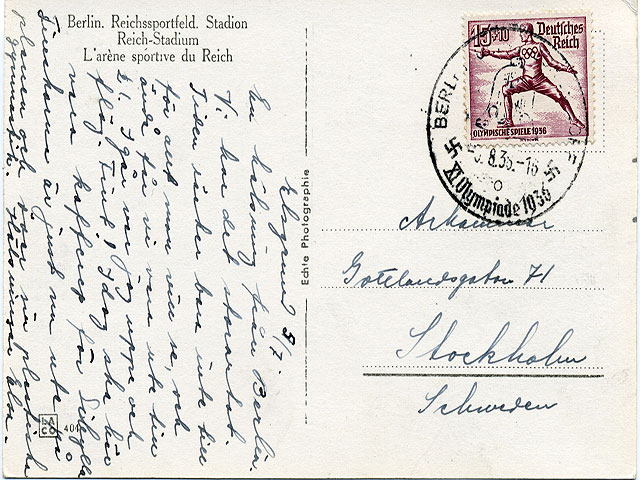 En hälsning från Berlin. Vi har det storartat. Tiden räcker bara inte till för allt man vill se, och ändå får vi vara ute till 21. Igår var jag uppe och flög. Fint! Idag ska här vara kafferep för Sibylla. Finskorna är just nu ute på planen och övar sin plastiska gymnastik. Hälsningar Elsa.