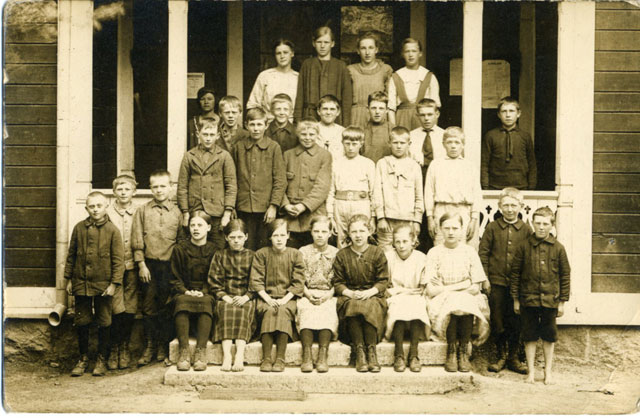 Här sitter en klass barn uppradade som man gjort i alla tider. I bakgrunden min unga farmor, kanske är det hennes första klass, någon gång i början av 1920-talet.
